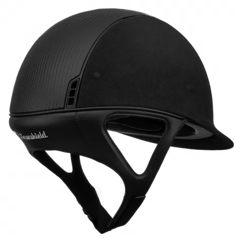 This stylish Samshield horse riding hat has a premium black alcantara shell, co-ordinated with a black leather top and a matt black trim and blazon.