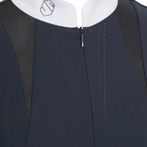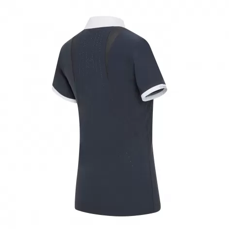 This navy short-sleeve competition shirt is made from a super-soft, high-stretch main fabric for an elegant silhouette, with contouring mesh panels on the chest and shoulders that make it perfect for summer riding.