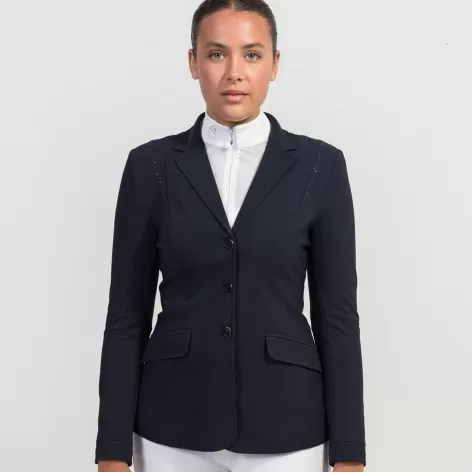 This show jacket is embellished with lots more stylish details, including three branded front buttons, stretch panels on the cuffs, and two front pockets with zip fastenings. The Samshield blazon in Swarovski crystals on the sleeve provides an original and distinctive finishing touch.