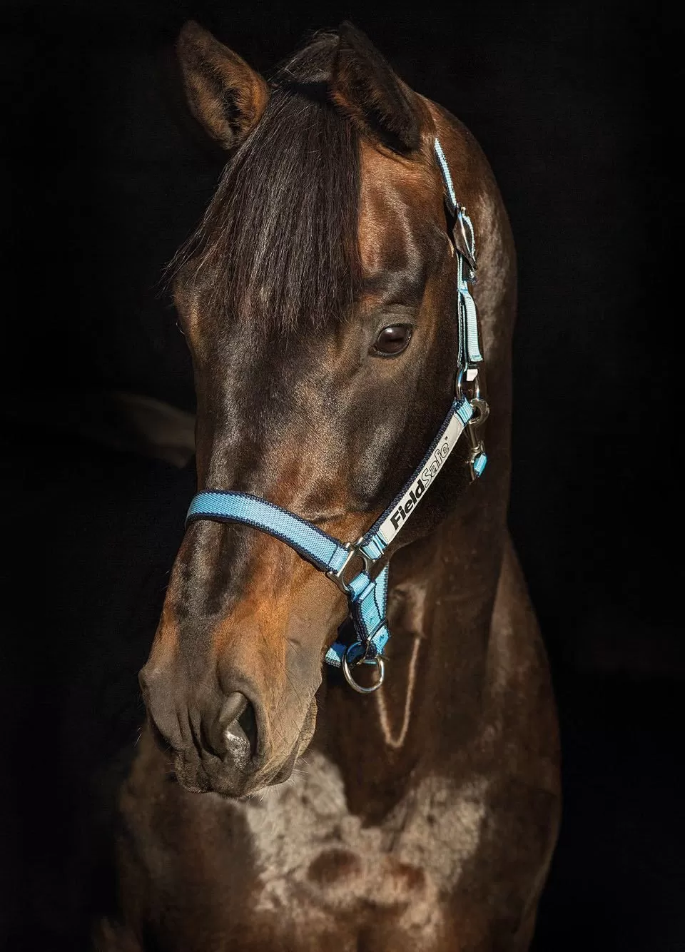 Safe for use in the Field with a velcro breaking point in case of panic. It has a quick release cheek clip and adjustable nose band to get the correct fit. It is lined under nose and headpiece to help prevent rubbing. The Nylon is a good weight and it has quality fittings. Also available in red and green, we have sold this design over many seasons with positive feed back.