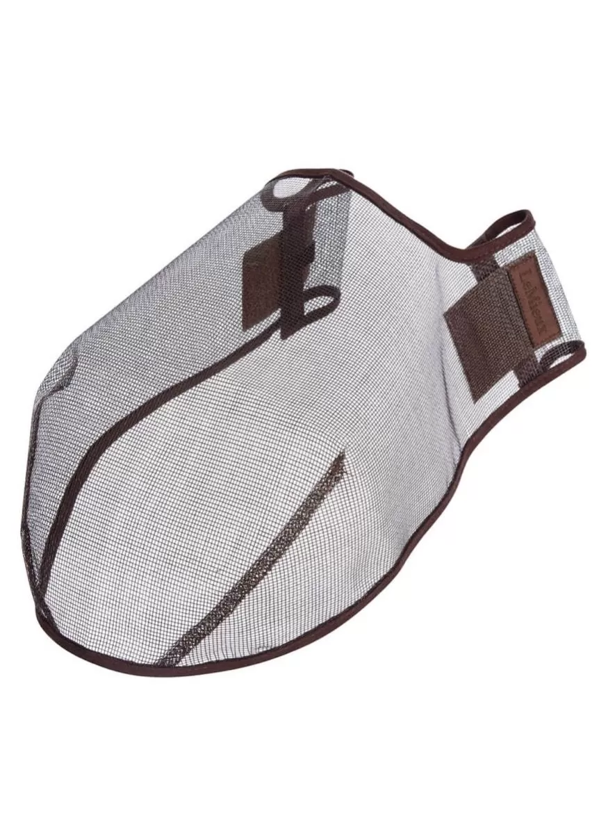 Cut away front section accommodates flash & grackle nosebands. Fine mesh effectively filters dust, pollen & other air born particles. Assists with the symptoms of head shaking & summer irritations.