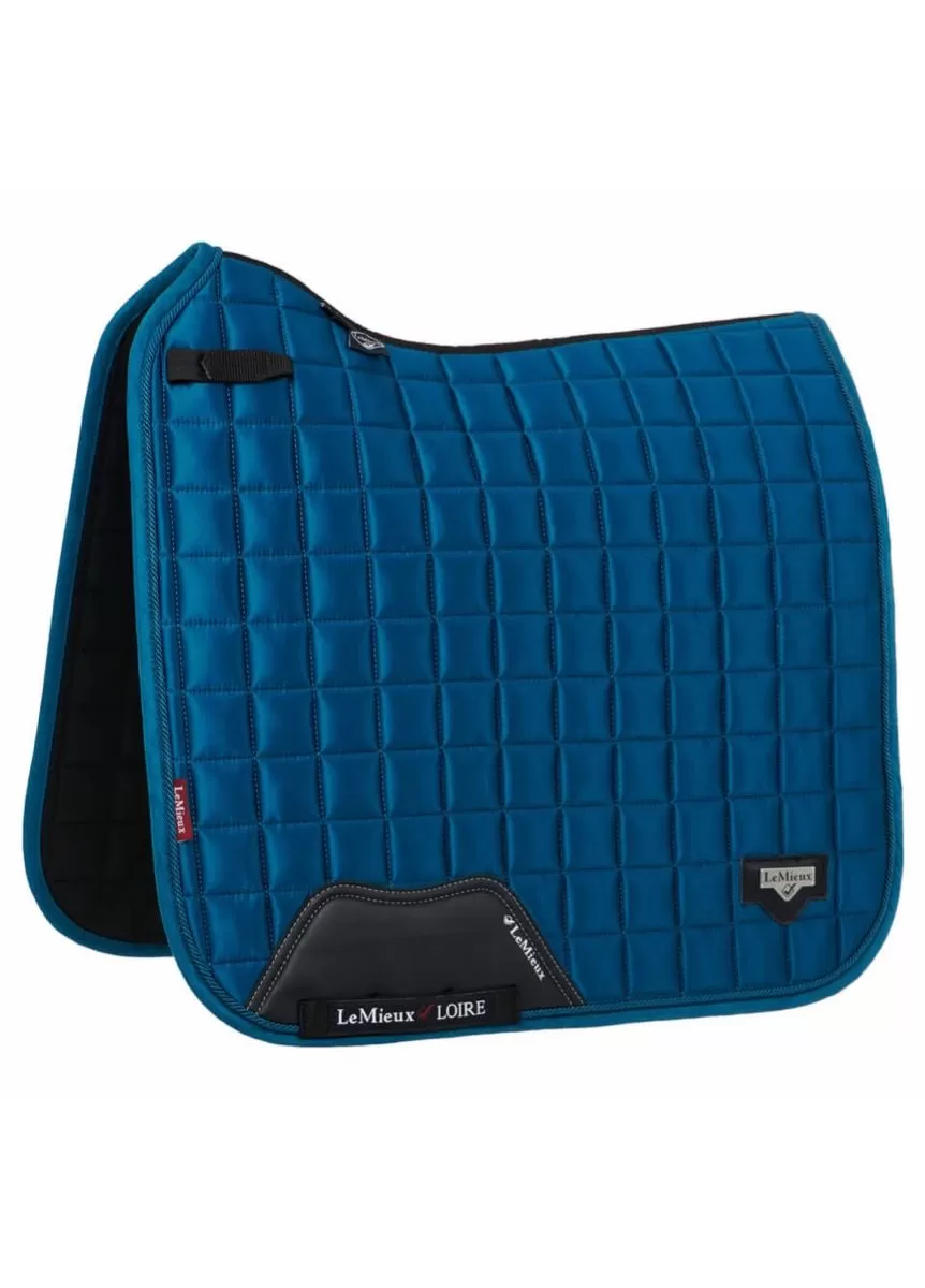 The textured PU leather girth protection area is complimented by an embossed logo and carries the usual signature LeMieux lower girth strap with its inner locking loops. The piece de resistance of the Loire Dressage Square is its unique metal badge on a leather mount in the lower back corner.