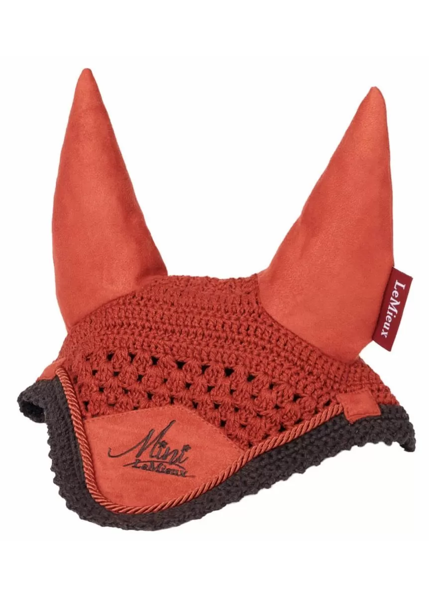 At last a premium designer collection for Kids! Mini LeMieux is intended to appeal to the under twelves with an eye for style. Designed particularly for 11.2hh to 13hh ponies, the Mini LeMieux Fly Hood is hand made from two styles of close-knit crochet with comfortable high-density fabric ears that soften sound. Suede embroidered detailing and colour matched braid complete the range