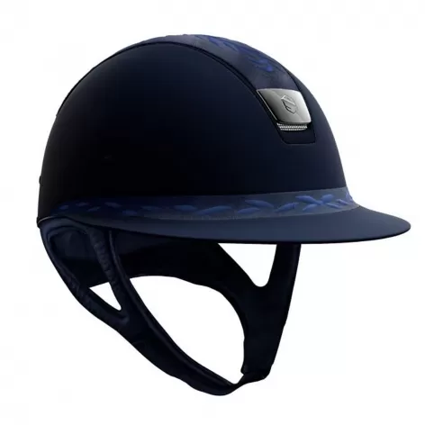 The latest Samshield Miss Shield riding hat features tone-on-tone navy embroidery in an elegant yet understated floral design on the top and band.