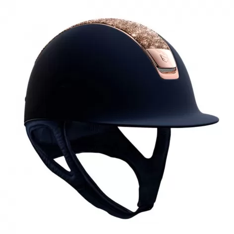 The combination of rose gold and sparkling crystal fabric on this navy Samshield riding hat is truly stunning!