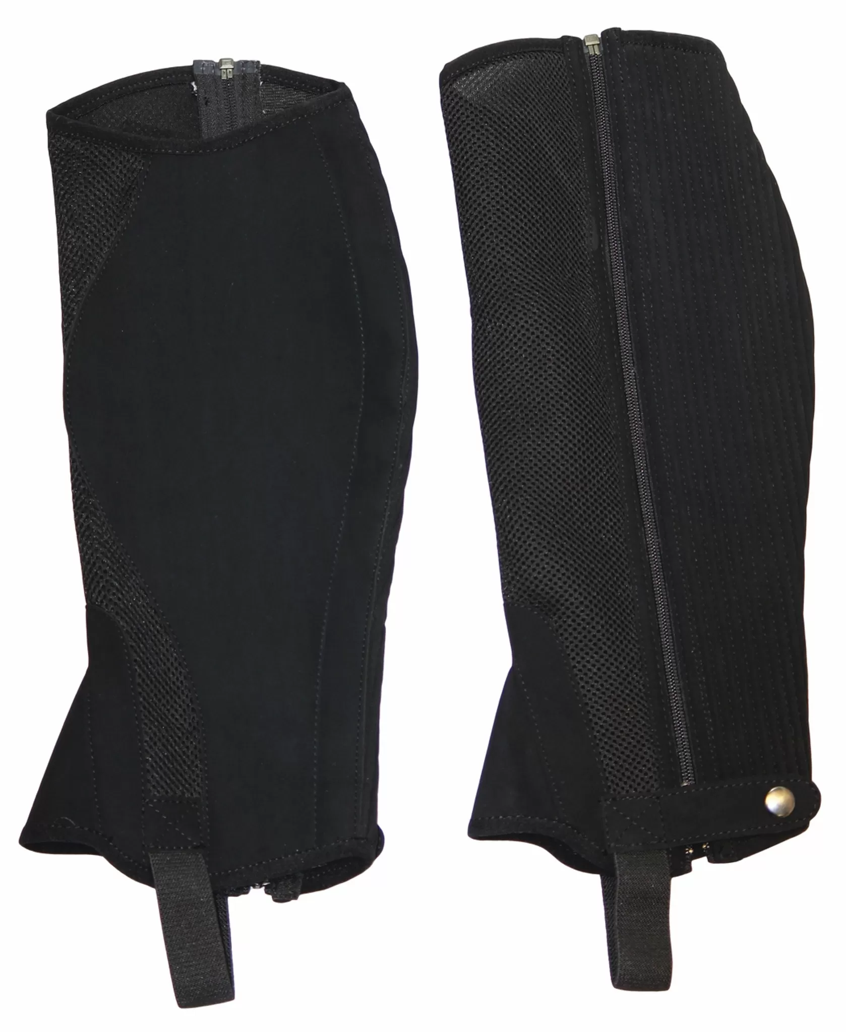 TuffRider children’s synthetic half chaps are crafted with an airflow material that is perfect for hot weather. Features include a solid inner leg panel for exta comfort and stability, as well as an elasticized leg gusset for a wonderful fit. Also included on this new design is a snap closure at bottom for convenience.