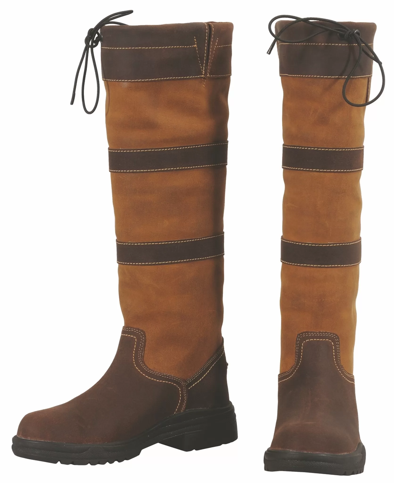 The Children’s Lexington Tall Boots from the Course Walk Collection by TuffRider are water-resistant, leaving your young rider protected from all weather conditions. Crafted with real leather and contrasting suede, this children’s boot includes a heavy duty maximum traction rubber sole for durability and comfort. An elastic gusset and attractive drawstring design are also included on the boot for superior functionality.
