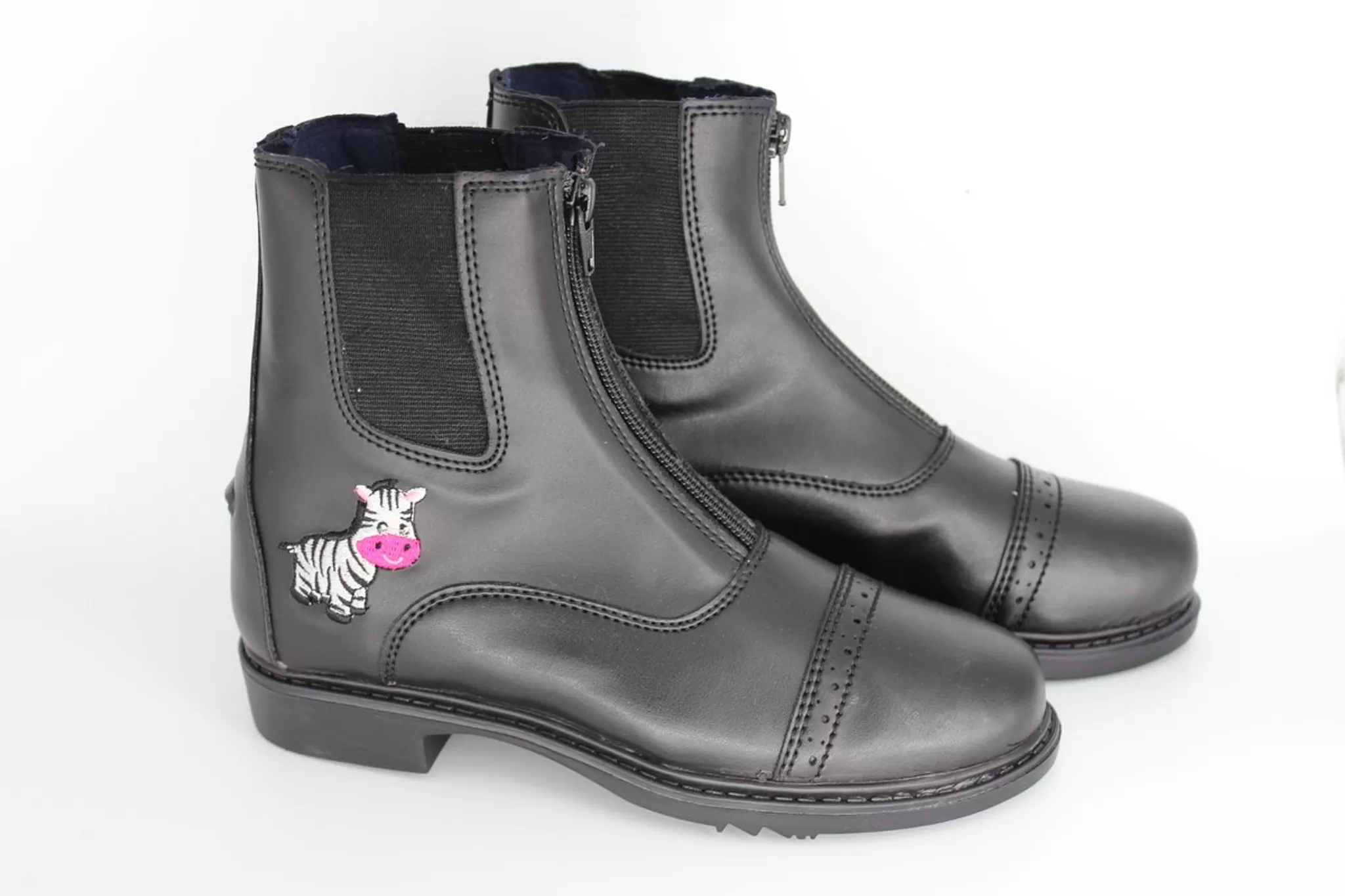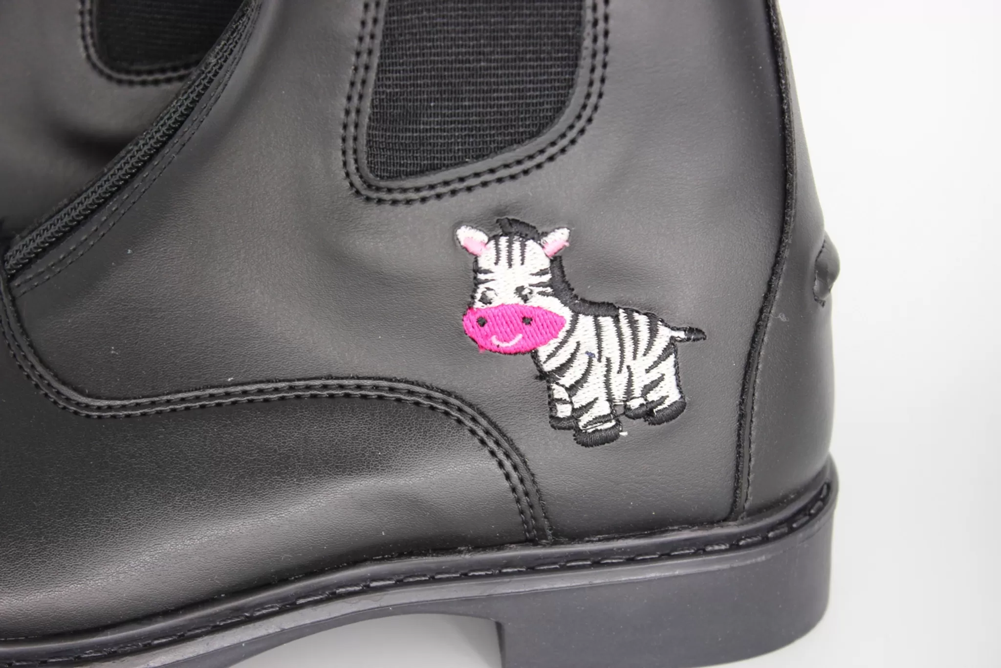 The popular Starter Front Zip Paddock Boots with an adorable twist! The TuffRider Children’s Zebra Starter Front Zip Paddock Boots come with the same great features like the side elastic gusset for ankle flexion, classic punched toe cap and durable zipper. A whimsical zebra-embroidered detail is perfect for summer pony camps or lesson programs. A synthetic leather exterior and rubber outsole ensures water resistance and durability.Â