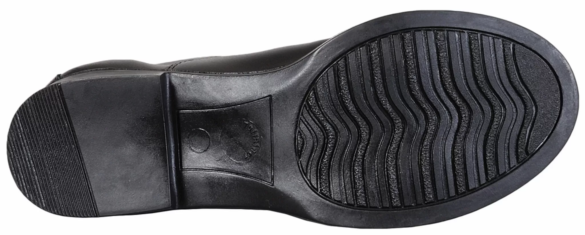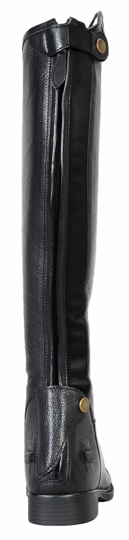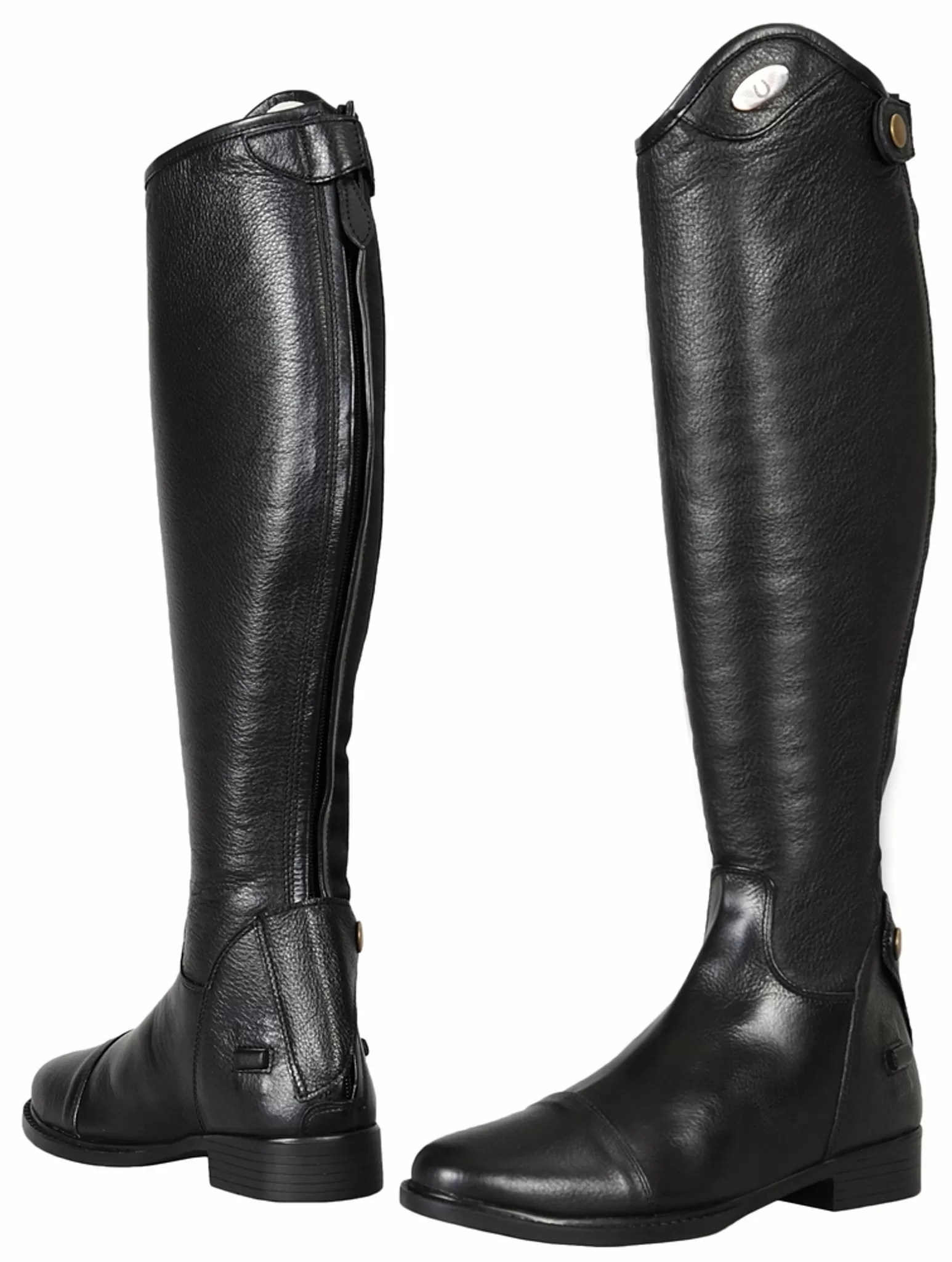 The TuffRider Ladies’ Belmont Dress Boot is made with the rider’s comfort in mind. Crafted with soft and supple leather, this elegantly styled, fully-lined boot features a punched toe cap and two side spur rests, as well as a moderate Spanish top with Tuffrider emblem at the knee. To provide the fit and feel of a custom boot, the Belmont Dress Boot has a full-length rear zipper bordered by a full elastic gusset, as well as a snap keeper at the knee and ankle, and comfortable foot bed.