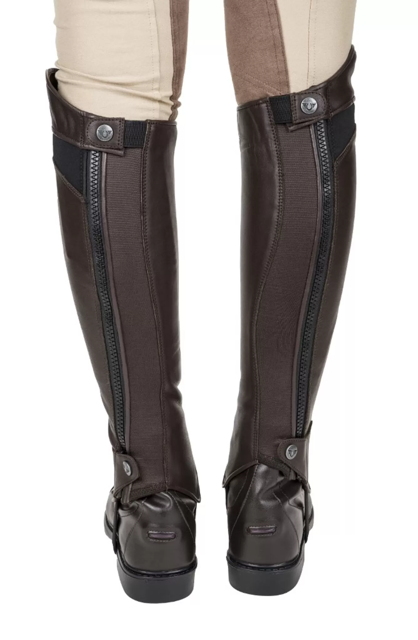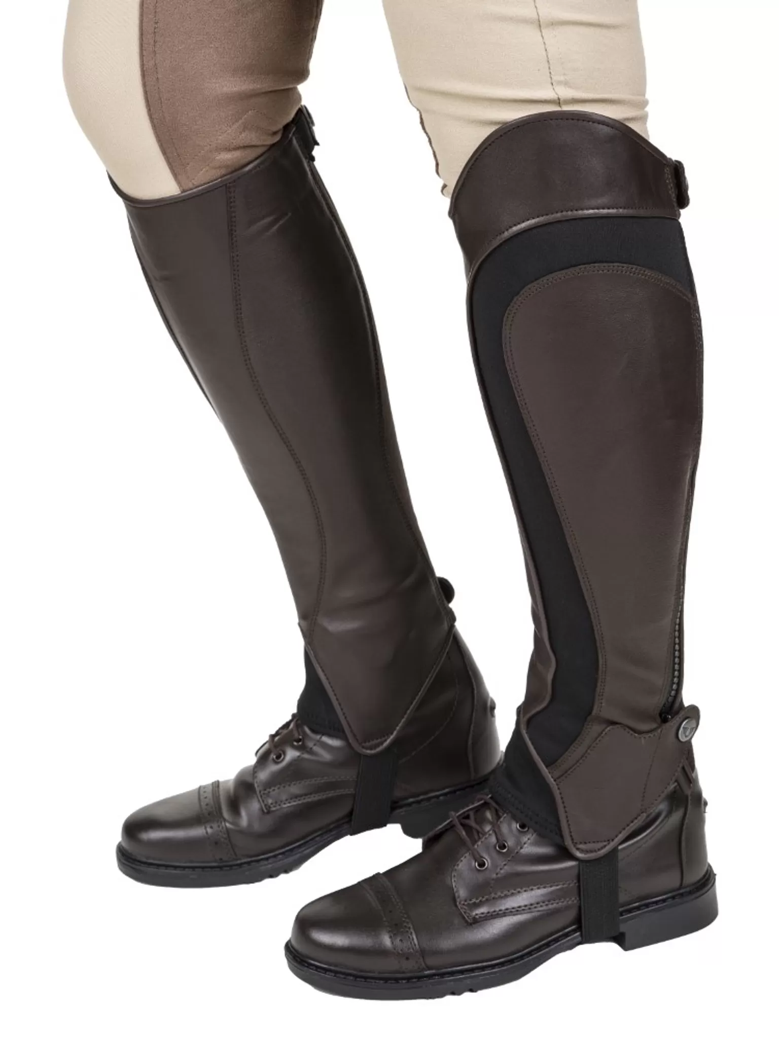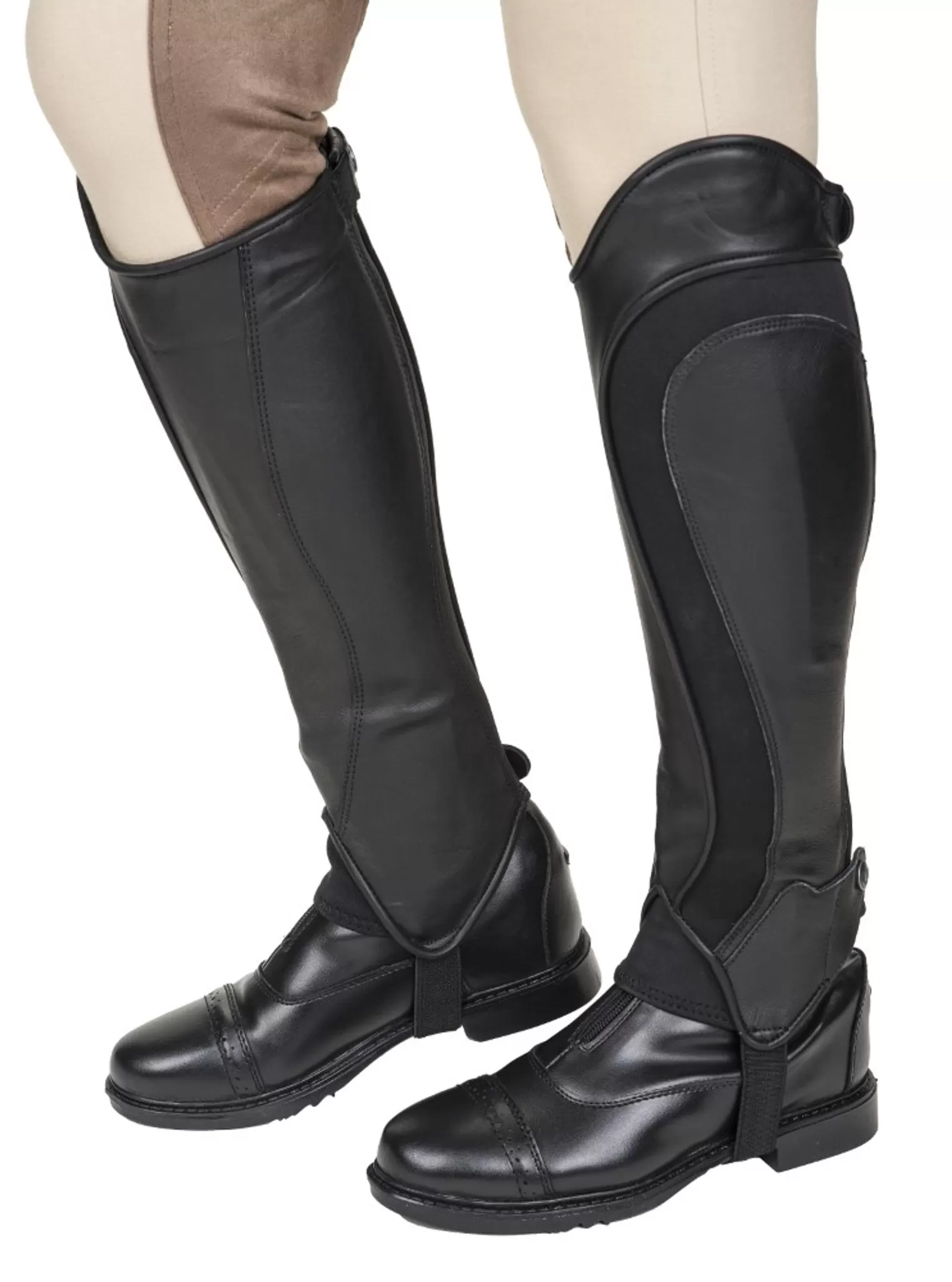 The TuffRider Ladies Derby Leather Half Chaps are crafted with a textured, durable leather and flexible neoprene for an added stylish touch. The striking design shapes to the contour of the leg while staying comfortably in place. The zipper closes from the top down for easy on and off while the snap closure keeps the chaps secure. An under-foot strap and elastic ensures a comfortably snug fit while in the saddle.
