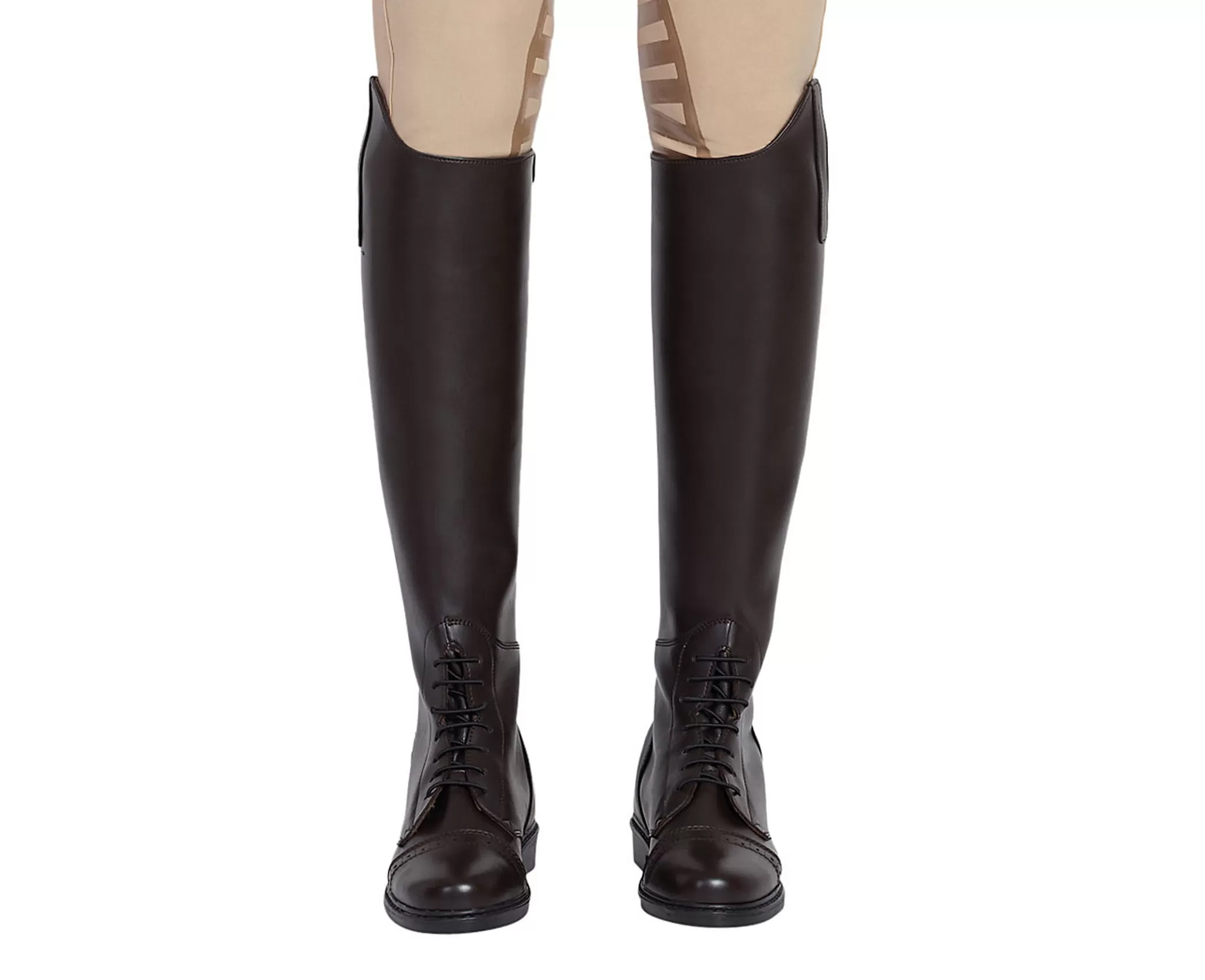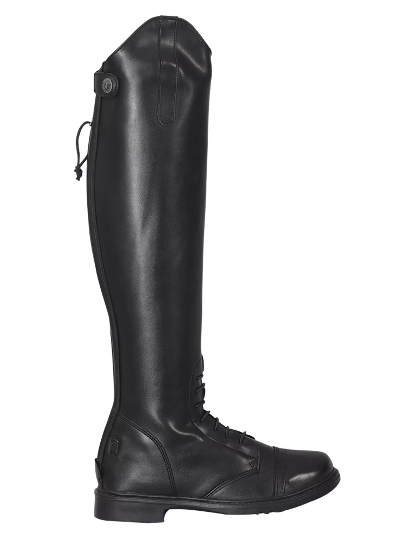 Dare to compare…no one will know you are not wearing a leather boot. This synthetic field boot has the look and feel of leather. It is made from a water resistant luxurious faux leather complete with spur rests, full back zipper and punched toe cap design. The calf is sculpted giving both a great fit and a long and elegant look when in the saddle. Fully lined with a performance foot bed and flex construction, this boot gives an immediate break-in.