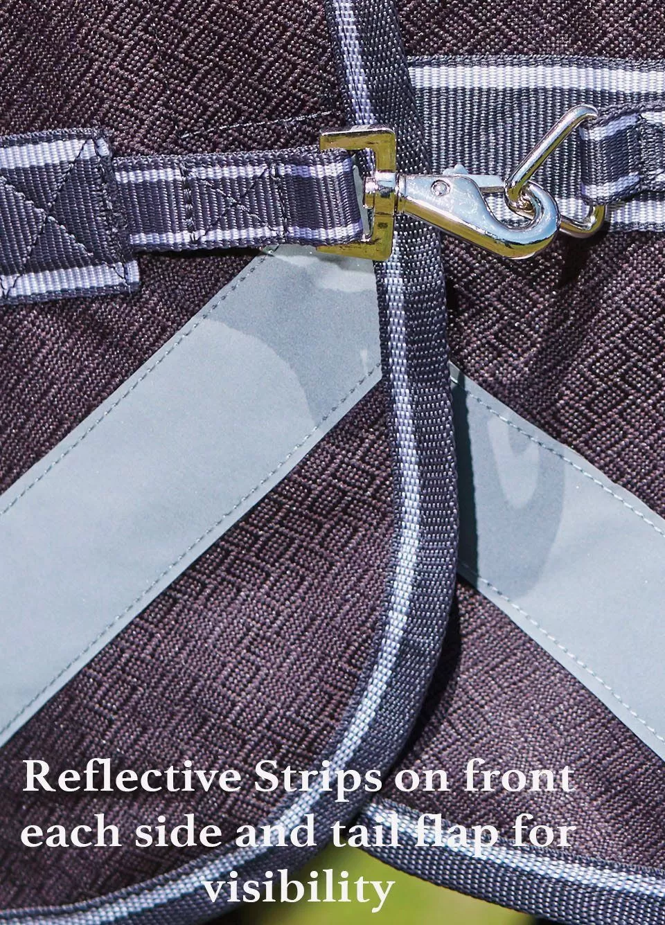 Further features: Traditional side gusset for natural movement. Elasticated, adjustable and removable leg straps for a secure and comfortable fit. Reflective strips on front each side and tail flap for extra visibility. Twin low cross surcingles and large tail flap for additional protection.