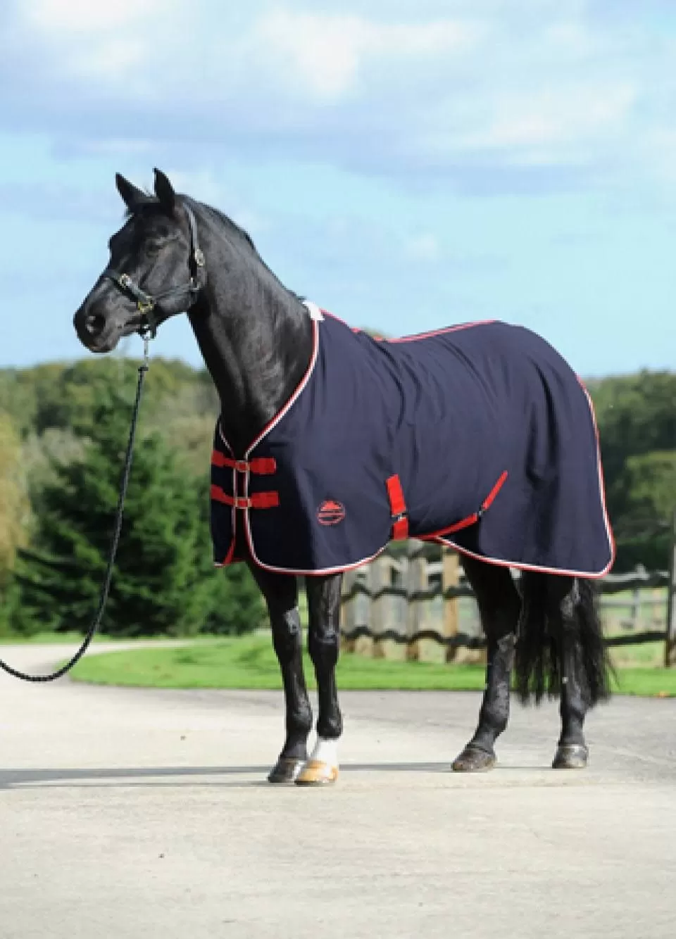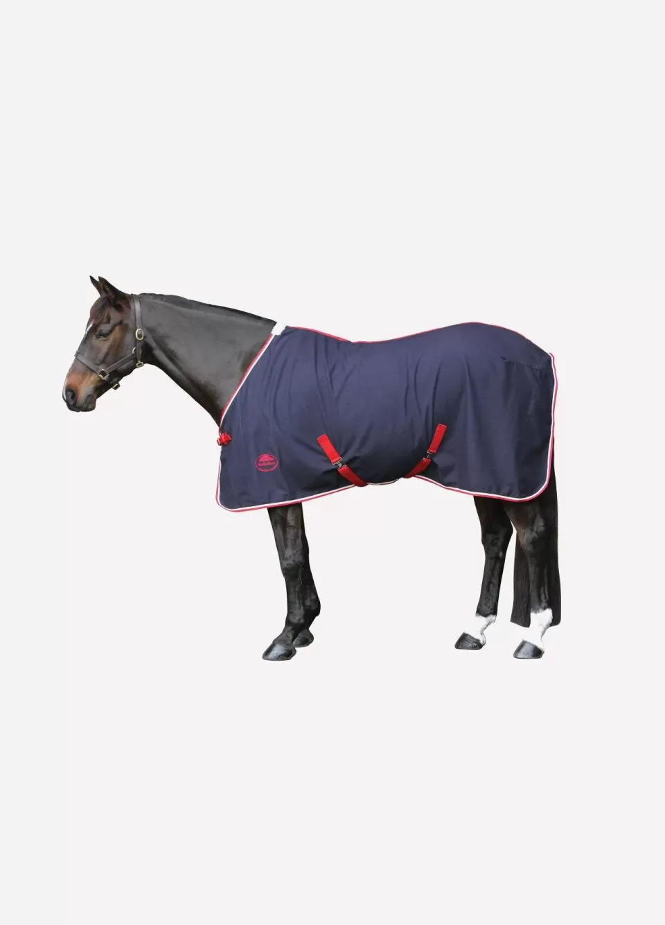 This sporty show sheet is ideal for getting your horse looking smart whilst he’s travelling to a competition! The lovely Navy, red and white colours are bold and stylish, and the soft lightweight cotton material means it’s the ideal rug for warmer summer shows! We’ve also found this rug to be ideal for warm nights in the stable, because of the fact that unlike many show sheets, it includes double front closures, double cross surcingles and a fillet string for maximum security.Â